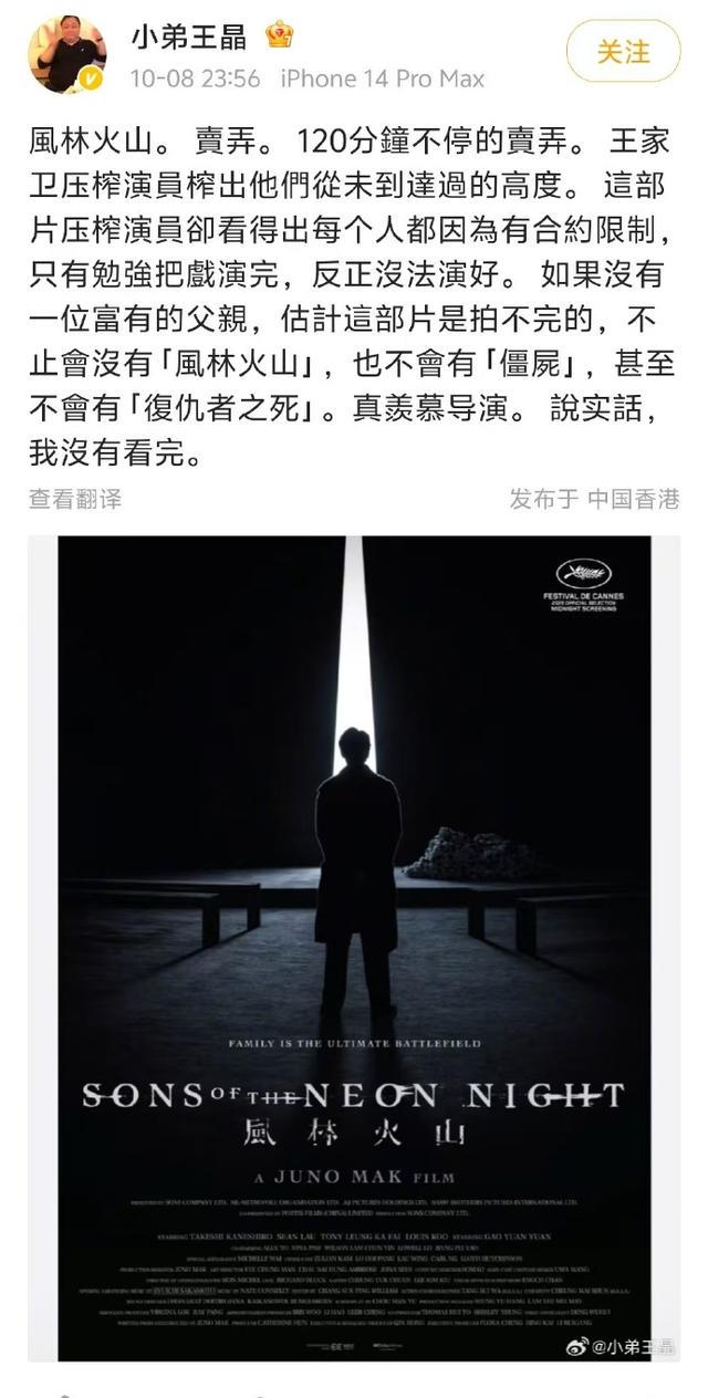 近日,王晶导演发文吐槽电影《风林火山》:“卖弄。120分钟不停的卖弄。 压榨演员榨出他们从未到达过的高度。这部片压榨演员却看得出每个人都因为有合约限制,只有勉强把戏演完,反正没法演好。如果没有一位富有的父亲,估计这部片是拍不完的,不止会没有《风林火山》,也不会有《僵尸》途牛配资,甚至不会有《复仇者之死》。真羡慕导演。”