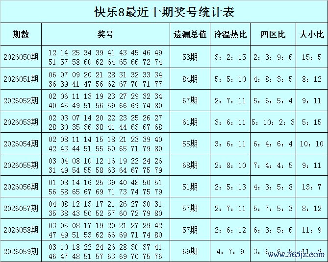 福彩快乐8第2026059期开奖回顾:03 10 18 22 24 26 28 30 37 41 46 47 48 51 57 63 69 70 75 76,其中奖号遗漏总值为69,冷温热码比为4:7:9,四区比为3:6:6:5。